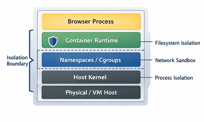 Each browser session runs inside its own container with: